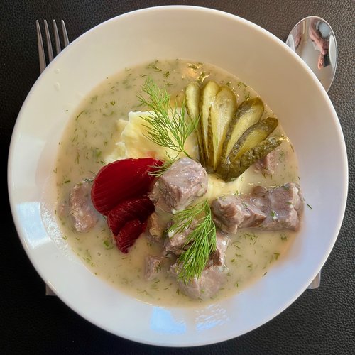 - Hauptspeise: Dillfleisch mit Kartoffelbrei und Rote Bete / Gewürzgurke